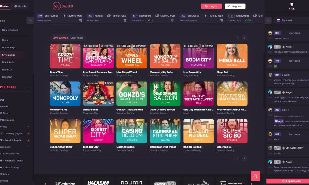 500 Live Casino is powered by Evolution Gaming, Pragmatic Play, and Ezugi. These companies translate the gameplay process from their studios.
