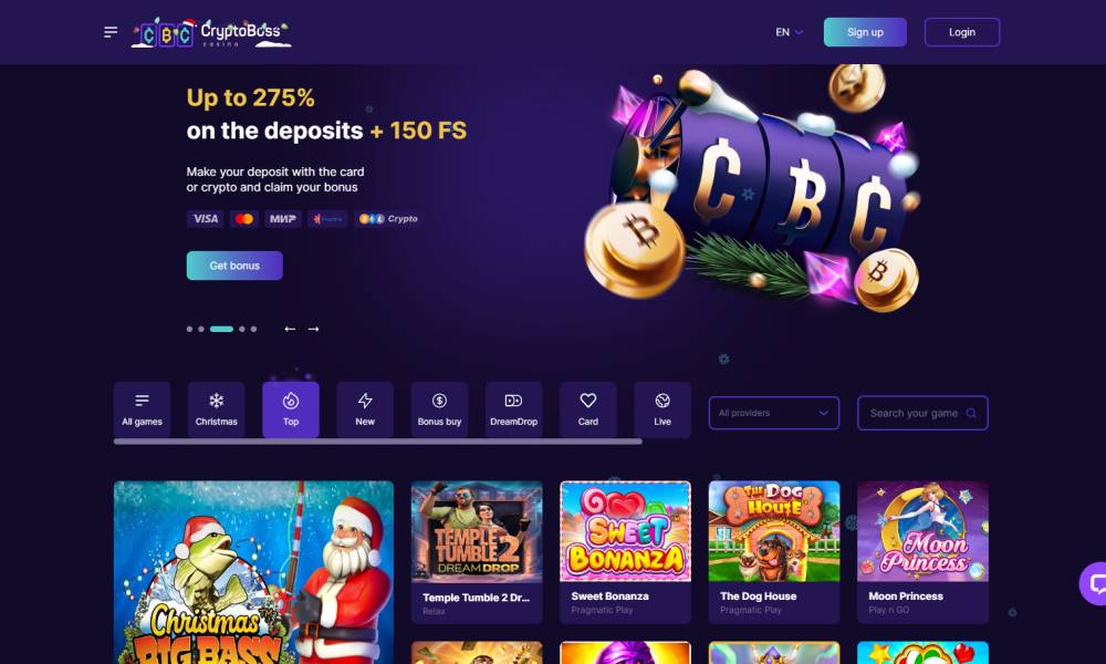 Do you want bonuses and free spins on your first three deposits? Such gifts are offered to new players by the online casino CryptoBoss. The club features a vast collection of slots, table games, card games, etc. There is also a live casino with hundreds of diverse gambling games from leading providers. Regular players receive cashback and weekly reload bonuses. Numerous privileges await them within the loyalty program.