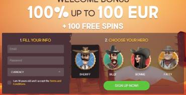 As soon as you enter the website of Gunsbet Casino, you get to Wild West. A courageous sheriff, Billy the accurate shooter, charming Bonny and fat Fatty will be around during the game. It is possible to choose a hero while registration. Characters of westerns are also imaged at different pages of the website and banners.