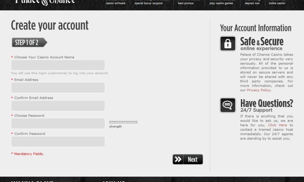 The process of creating an account at Palace of Chance is standard and straightforward.