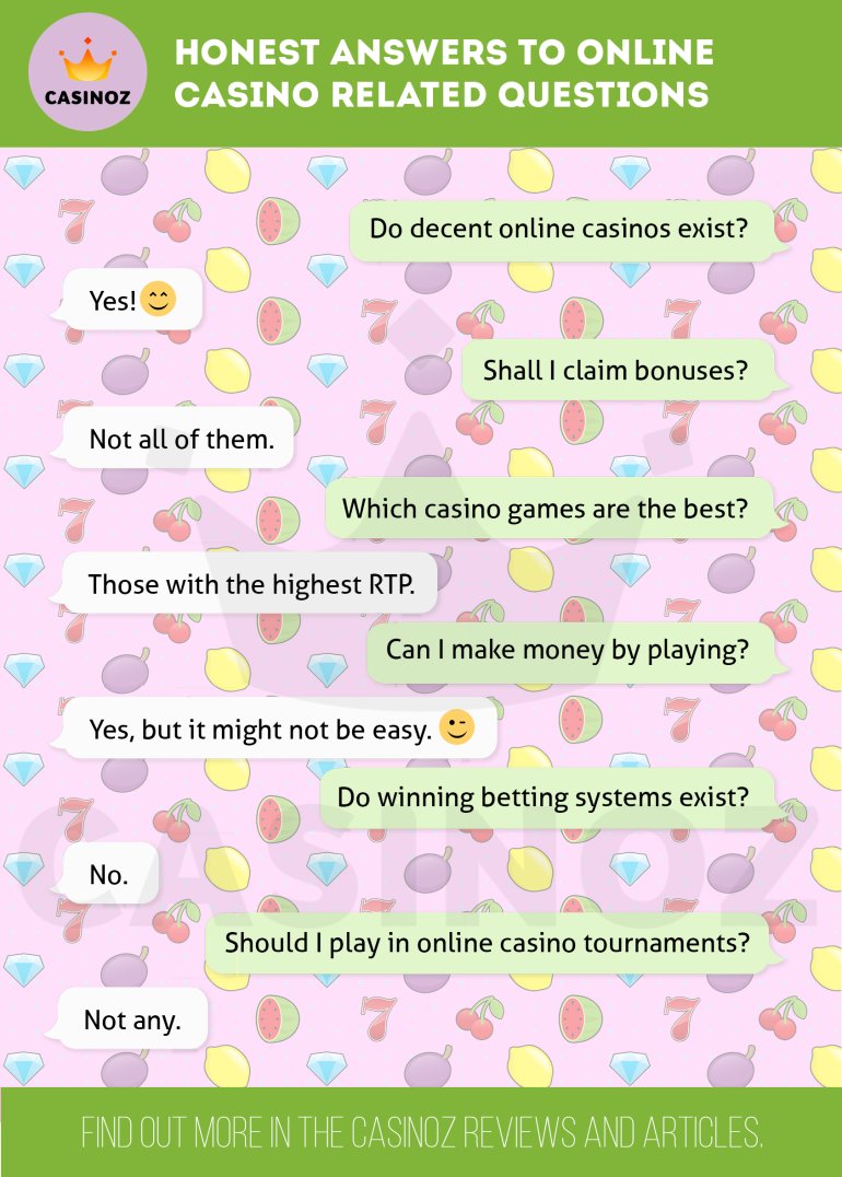 We have examined the most frequently asked questions about online casinos. The others are technical details, strategies, games, and other non-core issues. If you have not decided whether to play in an online casino, check out other publications on Casinoz. There, we honestly and impartially reveal all sorts of topics. Indeed, they will help you to make the right decision.