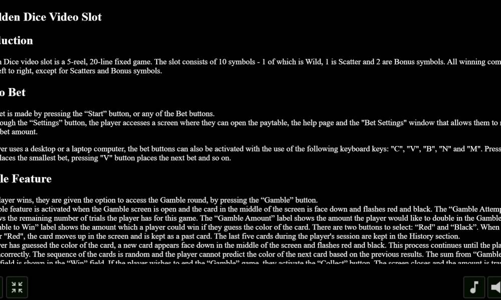 Launching the online slot 20 Golden Dice, it is worth going straight to the menu. It has settings for autopins and sound effects, payout table, description of features and rules of the apparatus. After reading the information you can start the game: