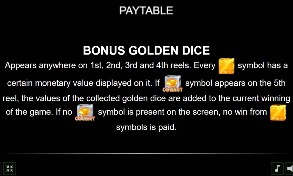 Bonus Golden Dice. When one or more dice with money values are rolled on the field and the Collect symbol stops on the last reel, the player receives a payout. All amounts from the golden symbols are added together and multiplied by the bet.