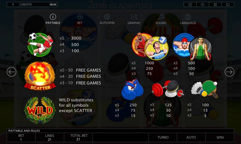 The gaming symbols, which you will see at the screen of «2016 Gladiators», are images of different sports and gear. All symbols are animated and colorful video plays when any combinations are formed. The following symbols are provided with advanced functions: