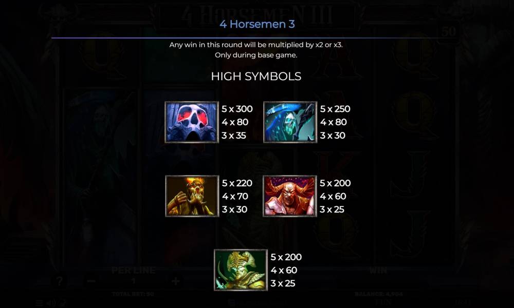 4 Horsemen III slot presented by provider Spinomenal is dedicated to the biblical apocalypse. Four horsemen went to this world to put an end to its existence. Magnificent musical and graphic design of the slot machine in combination with a similar setting make a lasting impression.