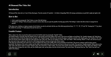 40 Diamond Plus online slot has 5 reels, with 4 rows of symbols in each. The payout mechanics are interesting - right to left and left to right from the outermost columns in a row on 40 fixed lines. Payment is made for chains consisting of 3-5 identical symbols. The game uses 4 types of higher and lower symbols each. There is also one special one, with which the bonus feature is associated. The developer has added its popular Gamble and Jackpot Cards rounds. The bet per spin players can bet in the range of 0.4-100 euros (equivalent in other currency). The maximum winnings are x1000 of the amount bet.