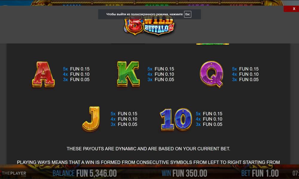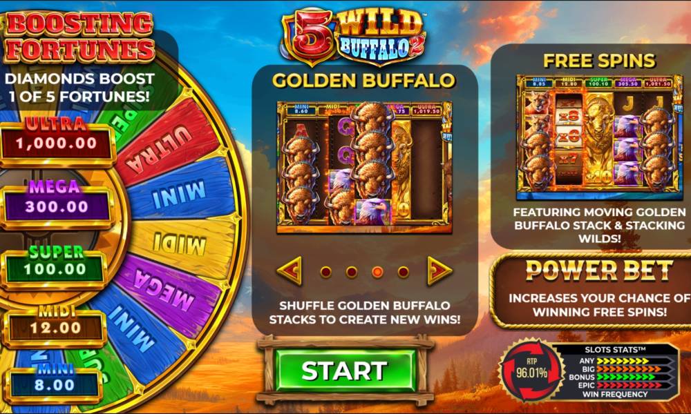 5 Wild Buffalo 2 uses the popular 5x4 playing field. Symbols must be placed on adjacent reels to form a winning combination. Absolutely any symbol can bring Boosting Fortunes diamonds that increase the chances of hitting jackpots. Winning combinations of symbols are counted from left to right, from 3 identical ones in a row (only 2 are required for Buffalo stacks). The player can bet from the range of 0.2 to 80 euros. The maximum winnings can reach x7500 per round. Bonuses come in the form of freespins, accompanied by a golden Buffalo walking symbol with a multiplier. The regular jokers are also able to stretch and bring Multiplier.