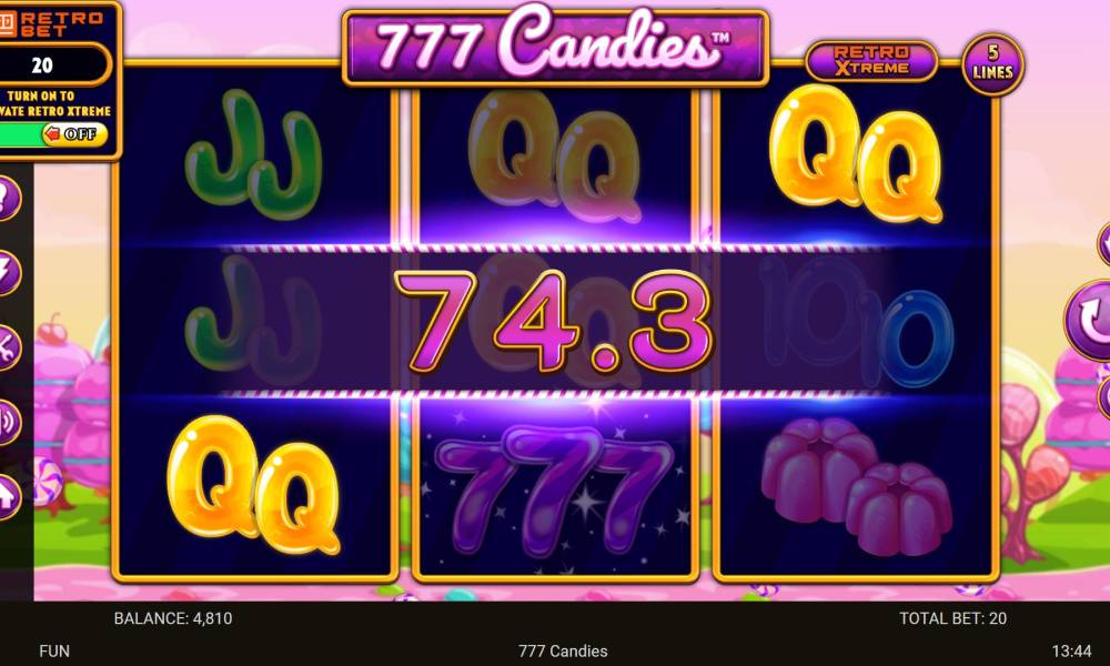 777 Candies slot features a classic playing field of 3 reels with a height of 3 cells, with 5 fixed paylines. Winning requires you to collect a combination of three identical symbols on one of them. The rewards in the pay table are very decent. The slot uses only 8 standard symbols and 1 special symbol. There are no free spins, and the bonuses are realized as an additional bet that increases the payouts for just one special symbol. The range of bets without activating Retro Bet Extreme varies from 0.05 to 50 euros. The medium level of volatility makes the slot suitable for players with different experience under their belt.