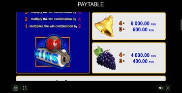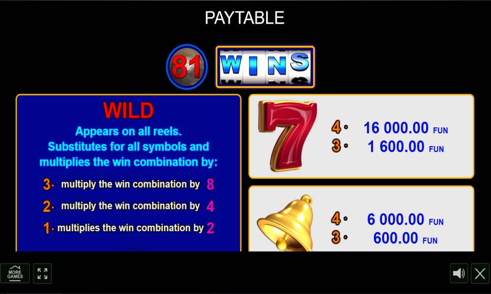 In 81 Wins slot the playing field consists of 4 reels with 4 rows each. Combinations are formed according to the standard scheme - from left to right from the first reel in a row. The player receives a payout for 3 and 4 identical symbols. In total, the game involves 5 junior and 3 senior symbols. Lines for payouts are fixed at 81. The maximum winnings are x1280 from the bet, which can be selected in the range of 0.1-100 euros. Online slot bonuses are represented by wild symbol, multipliers, risk game and jackpots.