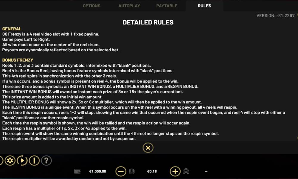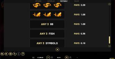 The playing field of 88 Frenzy online slot is 3x3, but there is only one payout line - the center one. The user is rewarded for three symbols. If they are any, the winnings are x1 of the bet. For 3 different types of fish player gets x2, and for 3 numbers 88 of any color - x6. If the same symbols fall out on the center line, the payment is more expensive. Three fish - x6, 3 pairs of fish - x12.6, silver, gold and red numbers 88 give x22.6, x56, x296 of the bet respectively. In addition to the three standard reels, there is a fourth additional reel, on it fall out exclusively bonuses. The provider added respins, multipliers and one-step cash payouts to the slot, which make the game more interesting. Put on the spin people can bet any amount in the range of 0.03-30 euros.