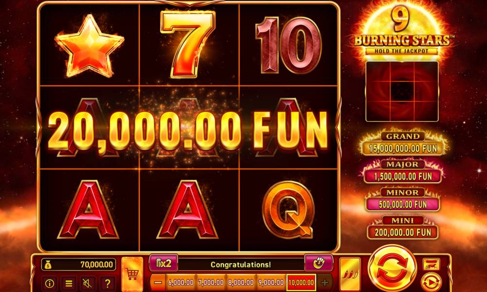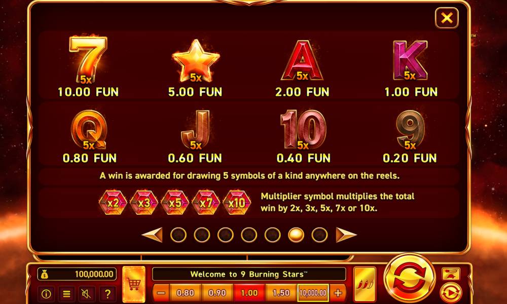 9 Burning Stars slot from Wazdan uses a 3x3 grid where winning combinations are formed when 5 identical symbols appear on the screen thanks to the Pay Anywhere system - there are no fixed lines. This makes the game process easier and more dynamic. Stakes during the game vary from 0.2 coins and up to 10000 coins. And the maximum winnings reach 1500x of the bet amount at the moment of scrolling. The Main symbols include money signs and multipliers that can significantly increase your winnings. The key bonus feature is Hold the Jackpot, which is triggered when you collect the right number of Cash symbols on the matrix. Bonus symbols become sticky, and each new one resets the respin counter to 3. There are no free spins, but the respins mechanic in the bonus game allows you to extend the gameplay.