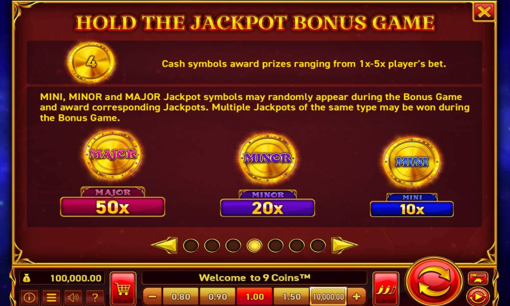 Wazdan's 9 Coins slot offers a unique game plan on a classic 3x3 playing field. Unlike many slots, there are no traditional win lines - all the focus is on the middle line, where bonus symbols must be collected to activate the game's main chip. Players can choose bets ranging from a minimum of 0.2 coins to a maximum of 10,000 coins, which makes the slot accessible to both beginners and experienced players. The main feature of the bonus game is the ability to fill the entire grid with symbols, which will lead to a Grand Jackpot win. The main objective is to collect three bonus symbols on the middle line, which will activate the bonus game with three free re-spins. In this game you can find symbols with multipliers, jackpots of different levels. The freespins feature allows you to restart the respins every time a new symbol appears on the reels. Thus, the bonus game continues until either the re-spins run out or the entire grid is filled.