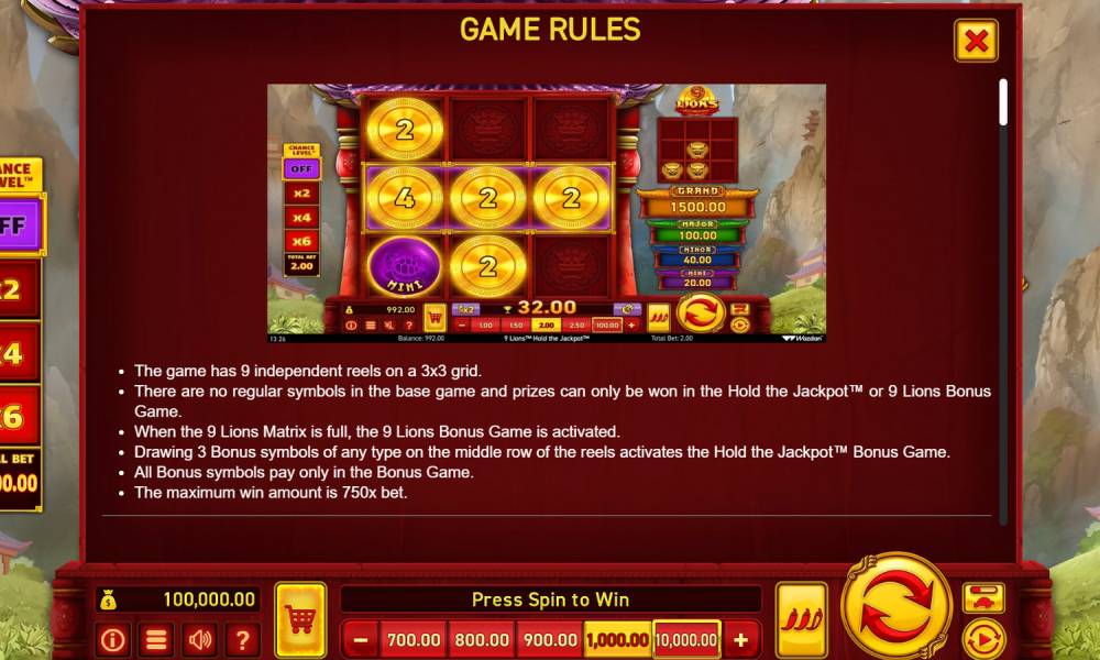 The 9 Lions Hold the Jackpot slot uses a non-standard layout - it is 3 reels of 3 cells each. The game lacks the usual paylines. The bet size can be set on the panel from 0.2 to 10,000 coins, and the maximum win is 750 bet multipliers. Winning combinations are formed only in the bonus rounds. Lions and coins activate bonus features, including Hold the Jackpot mode and a lion picking mini-game.