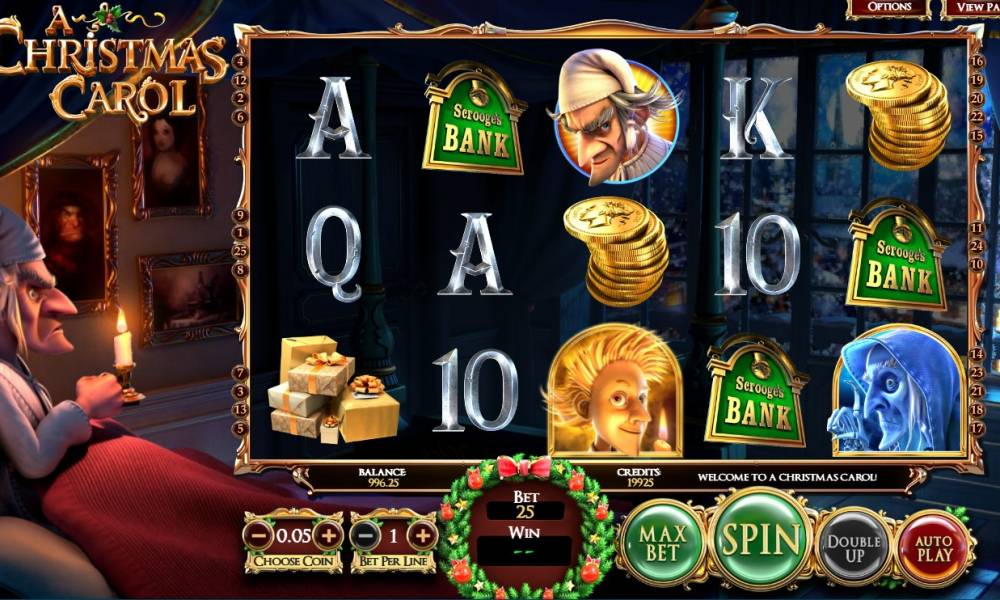A Christmas Carol is a 3D video slot by Betsoft. It features twenty-five permanently active paylines on which you need to place equal bets. You can wager up to five coins on each payline, with coin denominations ranging from two cents to one euro. This means that for each round, you can bet a minimum of fifty cents and a maximum of 125 euros.