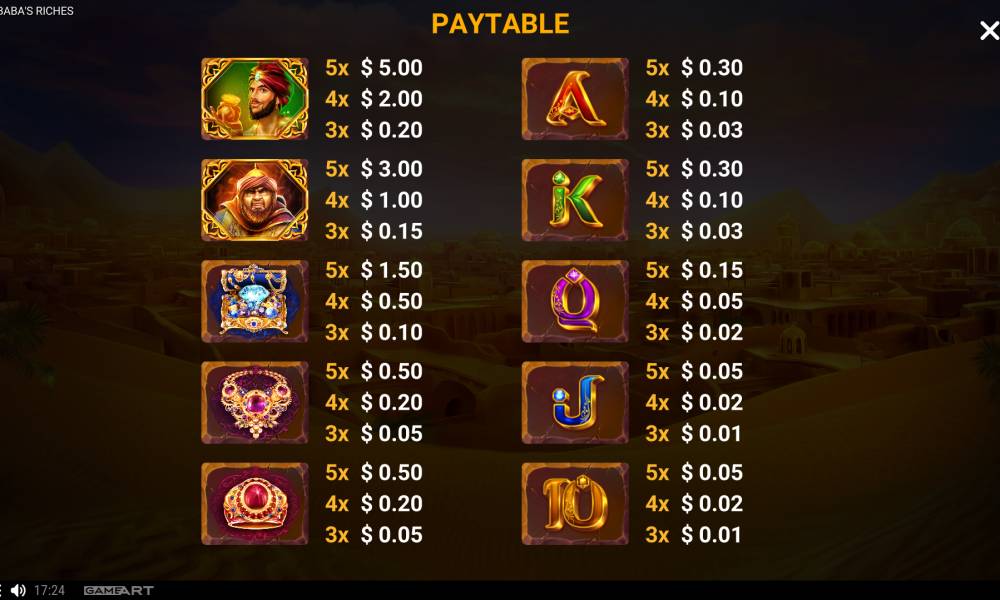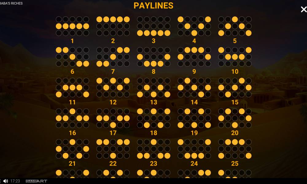 The playing field of Ali Babas Riches slot from the provider GameArt is represented by 5 reels with 3 symbols in each. All payouts are made on 30 fixed paylines.