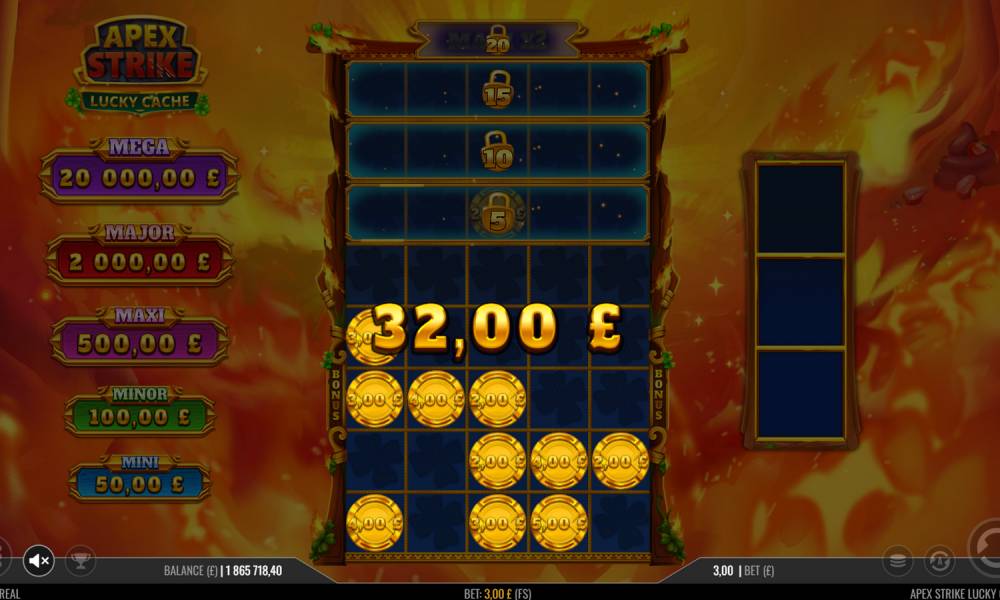The Apex Strike Lucky Cache video slot features 5 reels in 4 rows and 30 fixed paylines. For the duration of the bonus game, the field expands to 5x8, with an additional 4 rows at the start of the round closed. To win you need to collect 5 identical symbols so that they are located on the reels in sequence from the left edge to the right. Bets can be chosen from a range of 0.20-25 euros. The payout limit is x10,000 to the bet. If 3 or more identical symbols appear, a multiplier is applied to the bet. The multiplier values are shown in the payout table. The maximum multiplication x12.5 to the bet gives the fallout of 5 Wild. Scatters are paid only for 3 of them on different reels.