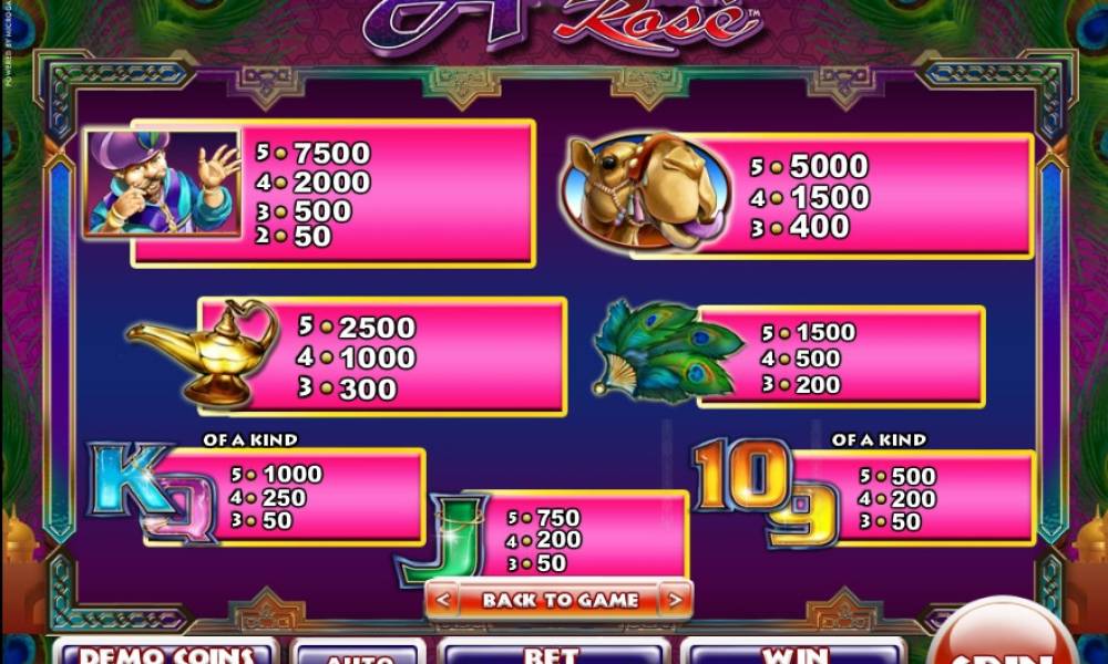 In the video slot Arabian Rose has, in addition to the payout table, a detailed section with the rules. Also available here are a variety of user settings, statistics and other options that make the gameplay more comfortable.