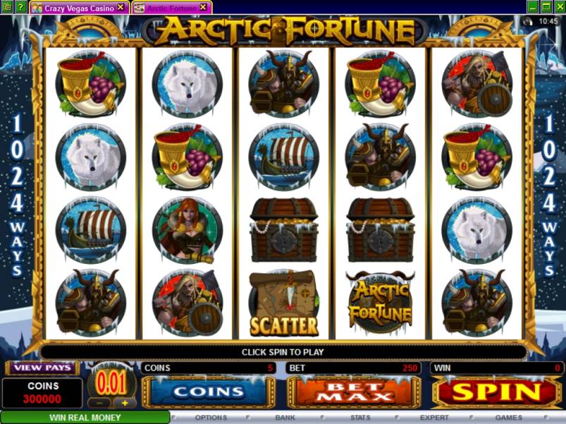 Arctic Fortune can hardly be classified as a usual slot. This free slot machine is traditional only at the first glance. In fact, you even can not imagine what is hidden inside. The boldest imagination fails, because you can hardly even imagine that the gambling machine could have 1,024 ways to win! It would be wrong to say that the slot machine is full of options. Nevertheless, the game has free spins, wild symbols and bonus rounds. In this game you can stake coins from one to twenty cents, which are multiplied by 50, and so we get the maximum bet slot machine. You can wager from one to ten coins per each line. If you are ready to resist them, use our help. For example, a bonus called Shoot the Spider can be a good help. In this game you will be able to join the horde of Vikings and surf with them on the cold seas of the Atlantic Ocean. The wild symbol Arctic Fortune can replace all symbols except for the scatter. The disadvantage is that the wild symbol appears only on the second and fourth reels, but in spite of this limitation, this option is quite efficient for a number of reasons and brings good profits. Three icons with suitcases will bring you the bonus round. It is beautiful even visually. At the beginning you have to shoot at the spiders, in particular, the red and black ones. As a reward you can get either free spins or multipliers. At the next level you have to decide at what target to shoot and get a prize.