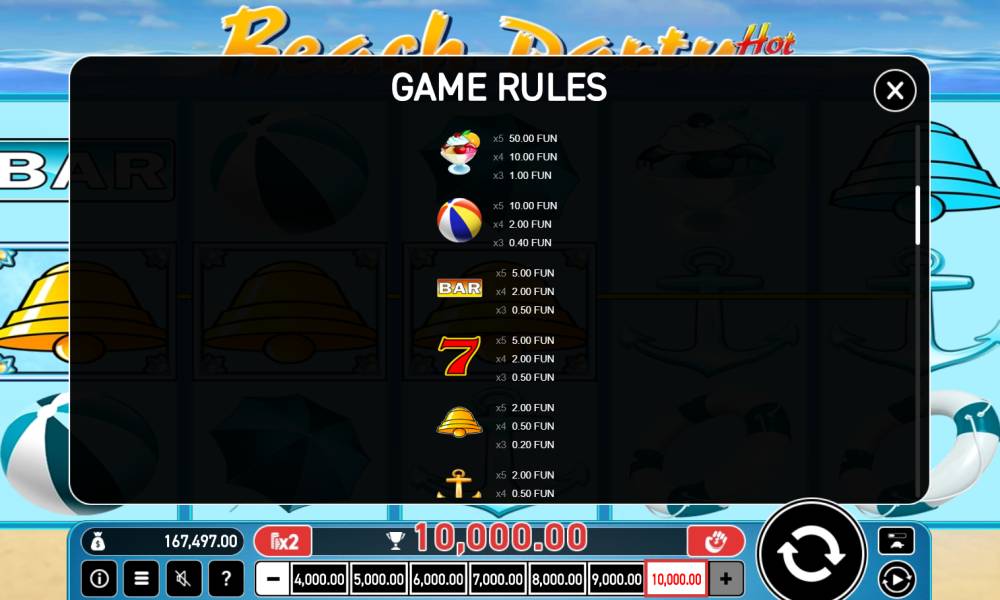 Demo of the slot Beach Party Hot allows you to explore the gameplay, evaluate the frequency of winnings and understand the rules without registration and investment. You can test all the features for free, including bonuses and risk game, without risking your budget. This is a great way to to understand the slot before playing for real money. Casinoz Casinoz has many demos, including this slot, for you to choose from.