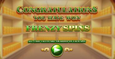 Frenzy Spins. This round starts when signs labeled Frenzy Spins appear on the field. Depending on their number, the corresponding number of free spins is assigned. During the game, only money symbols will fall on the field. They are paid out at the end of each spin and are not sticky. The player gets an additional spin in case the Frenzy Spins symbol falls on the reel. The game ends when there are no more free spins left.
