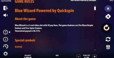 The Blue Wizard online slot has 5 reels in 3 rows with 30 fixed paylines. A winning combination must include identical symbols placed on the reels in a row consecutively in the left to right direction. Winnings on different lines are summarized. Appearance on the field of 3 or more symbols of the same name gives the opportunity to apply a multiplier to the bet. The exact values of multipliers are shown in the pay table. The betting range is from 0.20 to 100 euros.