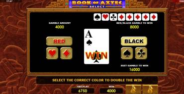 The Book of Aztecc Select has no special features, except for the risk game. According to the rules of the slot, to have a chance to double your winnings, you need to guess the color of one of the two cards, and if you risk guessing the suit of the card, your winnings will be increased by 4 times.