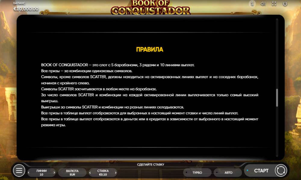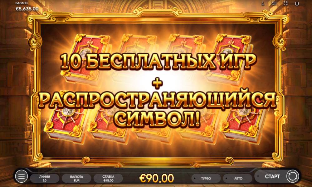 Free spins in the Book of Conquistador is a bonus feature with a spreading symbol. To start a series of 10 free spins, 3 or more Wild (Scatter) symbols must appear on the reels. A repeat of 10 free spins can be won during the free spins.