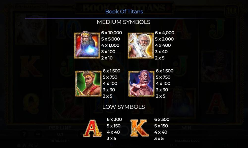 The playing field of this slot is presented in a non-standard format: it consists of 6 reels with 3 cells on each. The game has 10 fixed paylines, and winning combinations are formed exclusively from left to right. To get a prize, you need to collect at least three identical symbols on the active line. The bet size can be adjusted in the range from 0.1 to 100 euros, and the maximum winnings reach x10,000 of the current bet. Book Of Titans plays 9 standard and 1 special symbol. In free spins mode, the Expanded Symbol bonus is activated, which does not require matching paylines for a particular symbol. At the same time to win the senior symbols you only need to collect 2, and the junior symbols - 3.