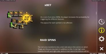 Raid Spins. The playing field becomes 4x5 and images of people - thugs and bosses - start to appear on it. At the bottom, left and right will move hunters and shoot at the villains. The player is given three respins, which resume each time a new symbol appears on the reels. All multipliers collected from the goons are multiplied by the bet.