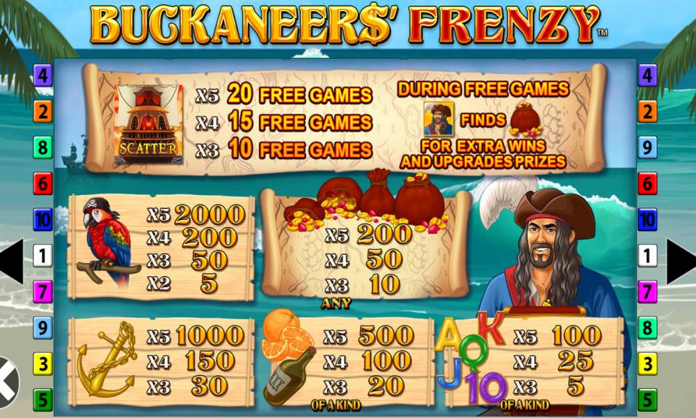 Buckaneers' Frenzy is a slot with 5 reels and 10 fixed paylines. To form a winning combination, you need to collect between 3 and 5 identical symbols starting from the leftmost reel. Symbols include traditional card denominations (A, K, Q, J, 10) and themed images such as a bottle of rum, orange, parrot, anchor and bags of booty. There are a total of 5 types of low and high paying symbols each. The parrot symbol is the most valuable and the only one of all brings a payout of 2 pieces per line. The game also has special signs that activate bonus features and free spins. Bet on the spin can be different amounts from 0.1 to 10 euros. Users can get large wins up to x50000 from the bet.