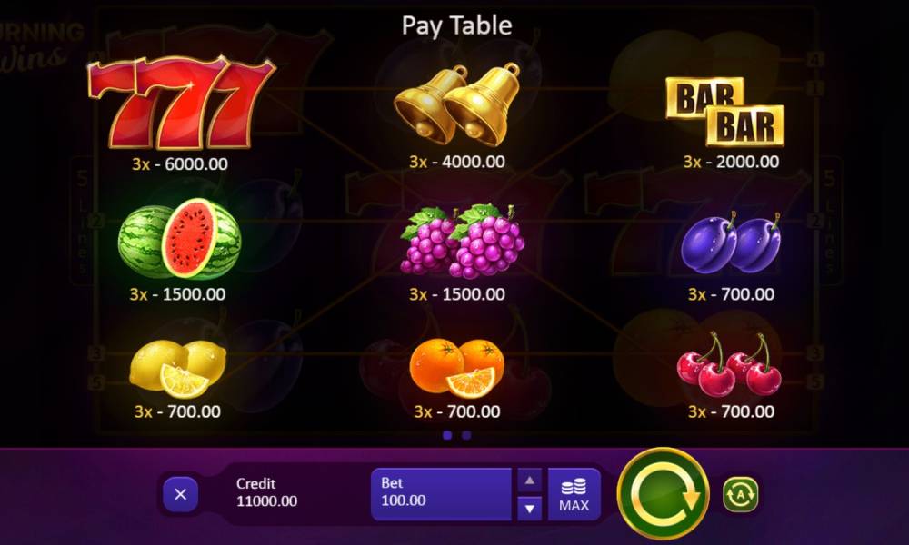 Burning Wins Classic 5 Lines Interface