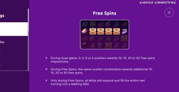 In the online slot Candy Carnival free spins are activated, when on the reels three to six Scatter symbols appear. The more Scatter symbols, the more free spins - from 10 to 50. During the free spins, Wild symbols become walking symbols, moving across the reels and creating new winning combinations. Free spins can be reactivated by getting additional Scatter symbols, increasing the chances of a big win.