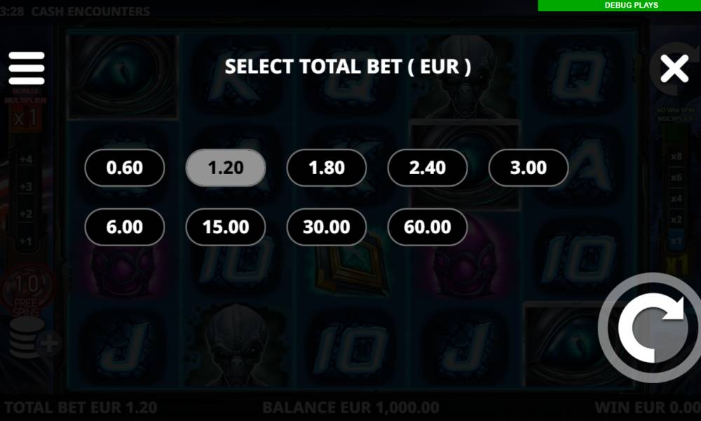 You must make the bet before every spin. The minimum bet is 60 cents, and the maximum - is 60 dollars per spin.