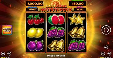 Cash Strike Hotstepper slot features a 3x3 game grid and 5 fixed paylines. Prizes are given for 3 identical symbols. There are a total of 4 junior (cherries, lemons, plums, oranges) and 5 senior (watermelons, grapes, bells, stars, sevens) symbols. One of the high paying symbols serves as the wild. There are also other special symbols that bring cash payouts and trigger bonus features. Users have the opportunity to win jackpots. The range of bets per spin is 0.1-50 euros.