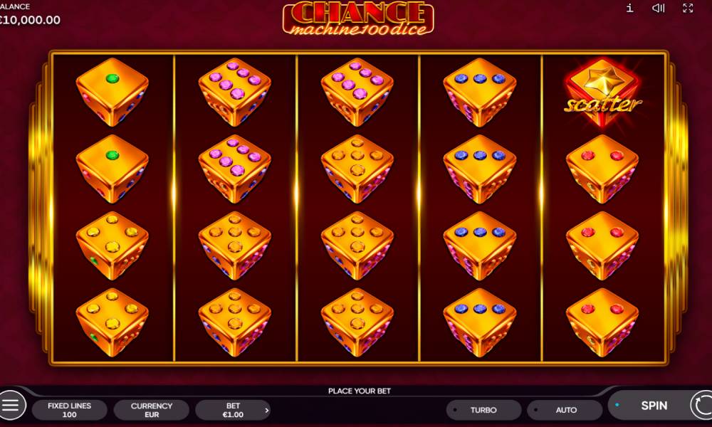 The timeless charm of traditional dice with their crisp edges and pleasing click has been given a luxurious frame in Endorphina's Chance Machine 100 Dice online slot. Golden dice with a chic inlay can give a lot of emotions and large winnings, reaching a maximum of x3,000 to the effective bet. The simple game hides precious "highlights" that increase the chances of winning: vertically increasing Wild, two high-paying Scatters, and a classic risk game.