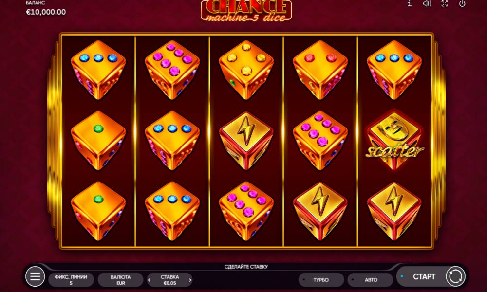 Online slot Chance Machine 5 Dice gives all players a great chance to get a significant winnings in the process of exciting rotation of classic dice with original graphic design. To create winning combinations help vertically expanding Wild symbol and two types of Scatter, and increase the prizes contribute to large multipliers and risk game.