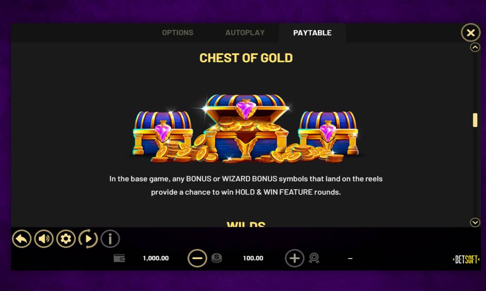 • Chest of Gold. Above the playing field is a chest of gold. It collects all kinds of gold coins. At random, the Hold and Win Feature can be triggered and two Bonus symbols and one Wizard Bonus will drop onto the field.