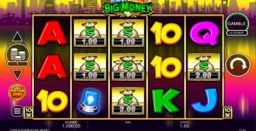 The game grid of the online slot Cops `n` Robbers Big Money has a 5x3 format, with card denominations and themed images (police car and blinker, bills and bags of money) appearing on it. The game uses 5 low and high paying symbols each. All of them make chains of 3 or more symbols in a row from the first reel. The payout lines are fixed at 10. The online slot is rich in bonus features - free spins, multipliers, chase the thieves, trial, risk game. Users can bet convenient amounts from 0.2 to 200 euros per spin.