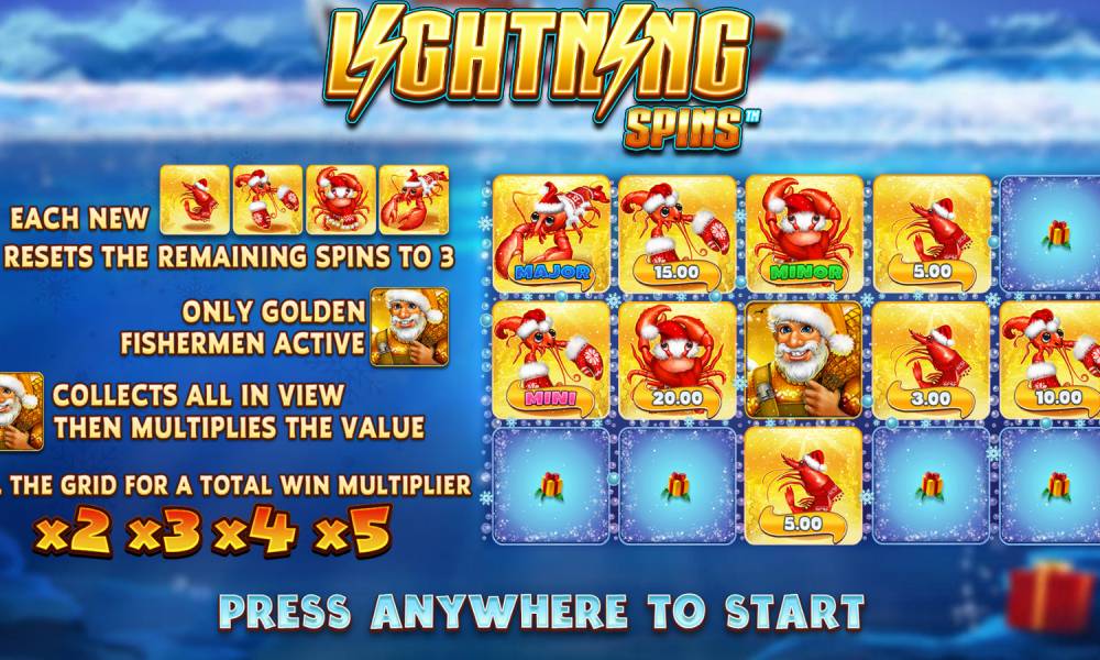 Lighting Spins. The trigger to start the round is the falling out of at least 4 gold money symbols on the field. They are immediately fixed in their places and give three respins. The spins are reset to 3 each time a crustacean appears and freezes on the reels. All money symbols pay out at the end of the round. If a fisherman appears on the field, he collects all the values from the crustaceans and adds to himself. The golden collecting symbol additionally applies a random multiplier up to x10. The round ends when three respins are played with no prizes or when the entire field is covered with symbols. In the second case, a random multiplier of up to x5 will be applied to the total winnings.