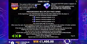 It is a high-volatile game. Be ready to go through a series of losing spins. The RTP of the Dance Party is average.