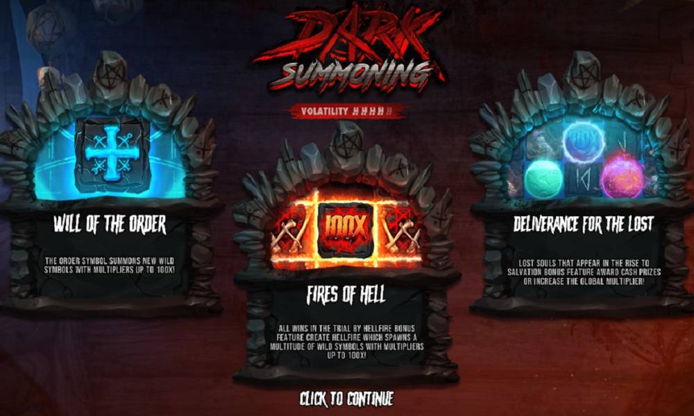 The Dark Summoning's main game uses a unique Super Cascade system: when a winning combination occurs, symbols are removed and new ones fill in the blanks, creating new chances for rewards.