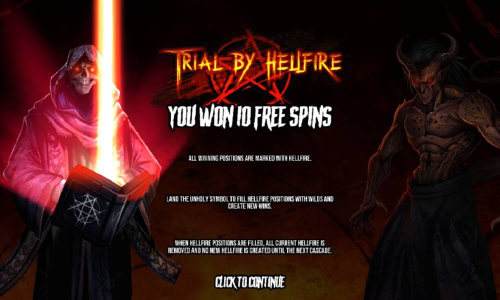 Trial by Hellfire. If you collect three Unholy symbols, ten free spins are activated. All winning positions in the bonus game are marked with Hellfire. The first Unholy symbol that falls out activates the Hellfire sequence. All symbols in marked positions are replaced by jokers, which can have multipliers. All Hellfire marks are removed. This process continues until the next cascade.