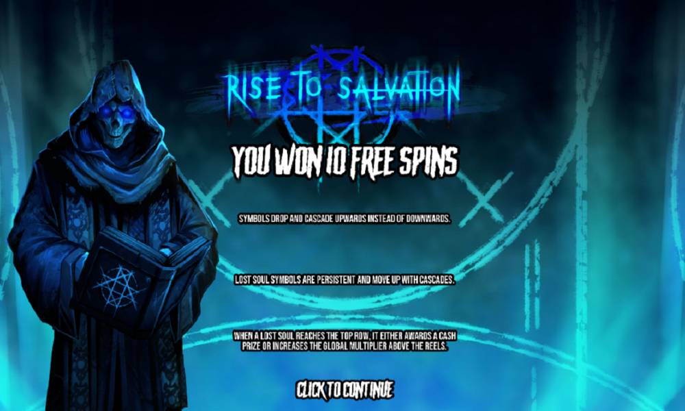 Rise to Salvation with ten free-spins is activated by collecting 3 Unholy and the presence of Order. The symbols fall upwards, adding Lost Soul symbols that remain until the end of the bonus. When a sign reaches the top row, it is removed and brings either a global multiplier or a cash prize.