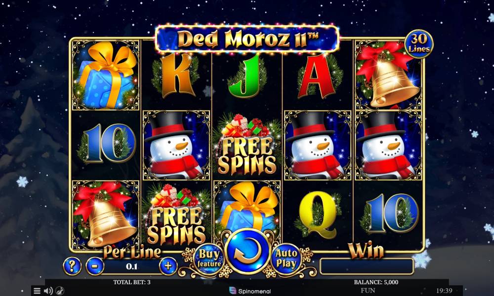 The Ded Moroz 2 slot machine from the Spinomenal provider has a non-standard playing field consisting of 5 reels with 3 symbols. All payouts are made on the 30 fixed lines.