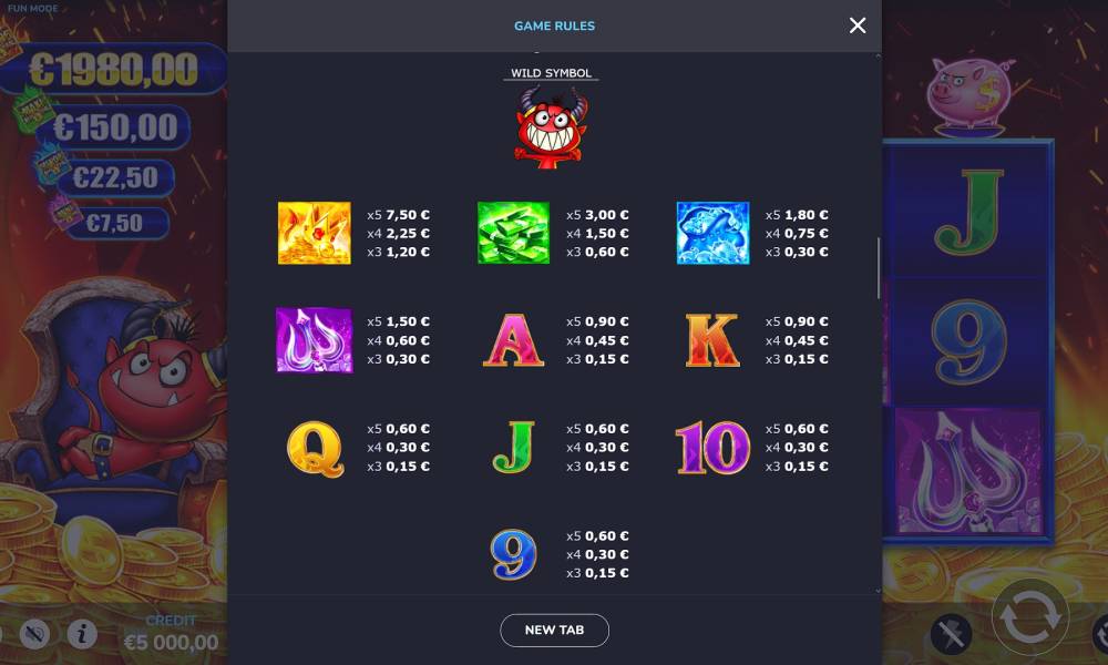 There is no Scatter symbol in the online slot, so the activation of free spins happens in a different way. When the devil stops on the field, he fills one or two piggy banks with coins. Then each of the piggy banks can give 6 free spins (if you are lucky enough to "break" them at the same time, it will be 12). Start free spins at any point in the main game, after which the pigs are emptied.