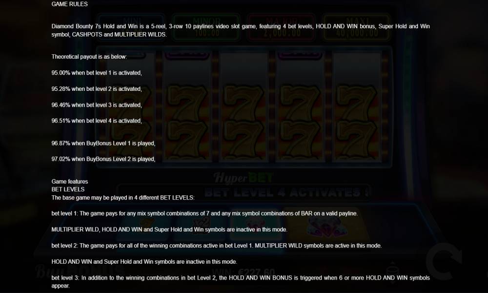 Retro styled slots usually also have rules that are similar to the old games. Diamond Bounty 7s Hold and Win is no exception: it has a small 5x3 field and pays on 10 fixed lines. The maximum bet is 100 (the currency is determined by the casino where the gambler plays). And the minimum depends on the chosen HyperBet level. In the first it is 0.10, in the second 0.25, in the third 0.50, and in the fourth 10.00.