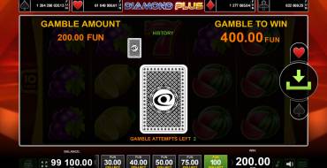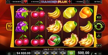 In the Diamond Plus machine, the game grid is 5x3, and the paylines are fixed at 10. It's not much, but combinations count both ways from the outermost reels in a row. All signs are paid for 3-5 pieces. Participate in the game senior (seven, bananas, watermelon, grapes) and junior (plum, orange, lemon, cherry) symbols. The betting range in the slot is 0.01-1000 euros. There are bonuses represented by the expanding symbol, risk game and jackpots. The maximum prize is small - x600, but thanks to frequent awards manages to collect a good amount, albeit gradually.