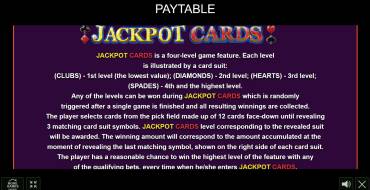Everyone can win one of the 4 progressive jackpots. To do this, you need to wait for the Jackpot Cards tourney to start and start flipping cards. As soon as three pieces of the same suit are opened, the prize of clubs, diamonds, hearts or spades will immediately pay out to the player. All progressive jackpots have no fixed size, reset after a win and are not linked.