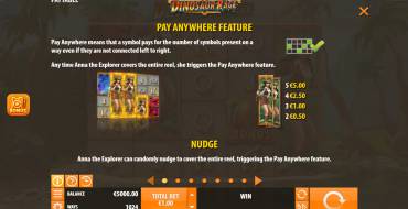 The Dinosaur Rage online slot has 5 reels in 4 rows and 1024 win lines, which pay out when identical symbols are placed in a row from left to right or as a result of the Pay Anywhere Feature, where the location of the symbols on the line is irrelevant. In order for the Pay Anywhere Feature to activate, it is necessary that the Anna the Explorer symbol covers the entire reel (occupies all 4 cells). If there are less than 4 images of Anna on the field, the Nudge Feature can be randomly triggered so that the girl scientist still occupies the entire reel and triggers Pay Anywhere. In addition, a roll of 3 or more same symbols (for Anna's Explorer - 2 or more) allows a multiplier to be applied to the bet. The multiplier values are listed in the payout table. The maximum multiplier x5 to the bet gives the appearance of 5 symbols with a charming Researcher. The range of bets - from 0.2 to 100 euros.
