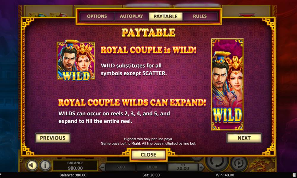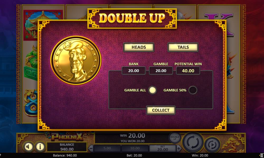 The Dragon and Phoenix online video slot has five reels, twenty lines, which are always active on default, and fifteen cells for symbols at the screen.